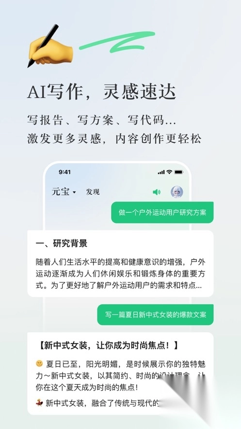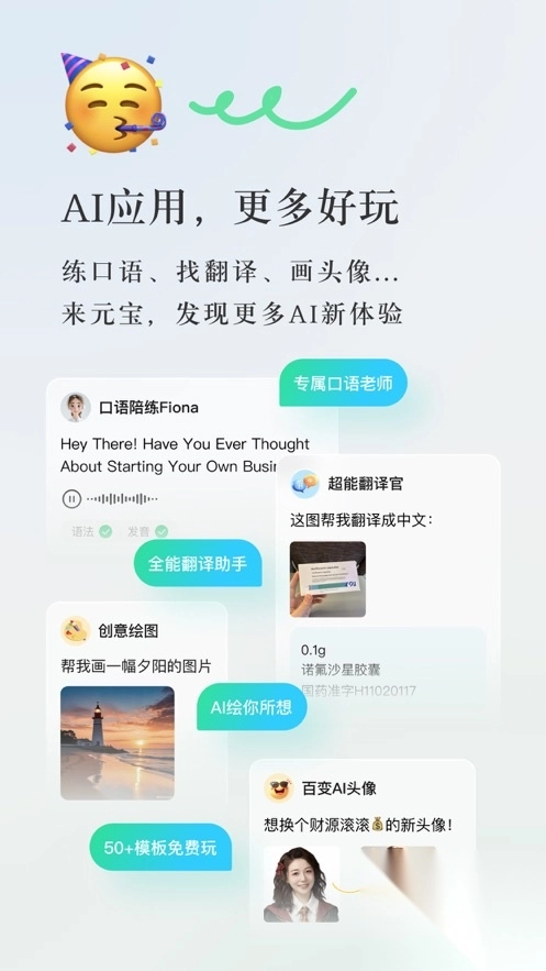 灵感迸发与即兴创作:元宝为用户配备了多款AI创作工具。您能够和元宝生图“交流”,只需一句话就能生成图片,并且有多种画风可供挑选。另外,还有写真馆、百变AI头像等智能体,期待您的创意发挥。