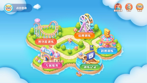 首页会展示针对视力问题的辅助训练内容,包括帮助改善眼位偏差的训练、提升视觉功能的训练,以及可以查看训练过程的功能入口。