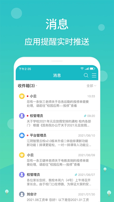 江阴智慧云校安卓版是江阴市教育局打造的智慧教育公共服务平台,专门面向本地中小学,融合了教育管理、家校互动、在线学习等多种功能。该平台把消息系统作为核心,涵盖校园日常运营的各个环节,能够支持学校、教师、家长三方协同合作,为构建高效的智慧校园提供助力。