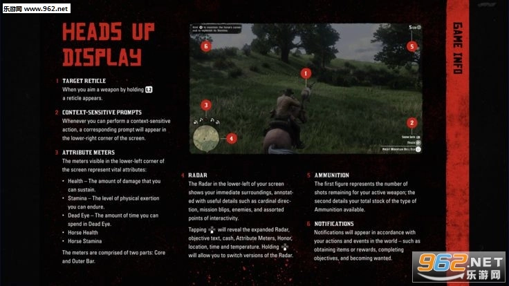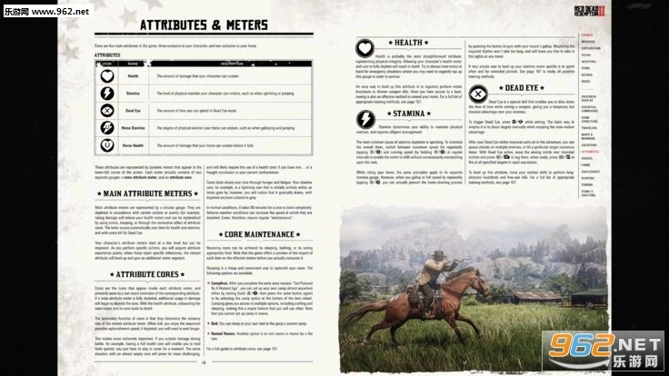 Red Dead Redemption 2 手册详细包含了游戏的基本操控内容,同时还涵盖了从玩家属性、战斗、钓鱼、狩猎、马匹默契度到各类活动等多方面的详细说明。