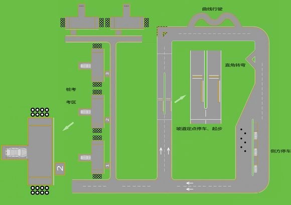 到达T型路口时,开启左转向灯,驶入上行车道并换至2档。随后开启右转向灯,在路口留意车流状况,确认安全后右转进入直行车道,档位保持在1-2档之间。当听到“请超越前方车辆”的指令时,观察左侧后视镜并打开左转向灯(持续3秒),之后关闭左转向灯。接着进入直行车道,在此处将档位加速至4档并维持10秒(车速不超过40km/h)。行至路尽头,开启右转向灯进入学校区域,挂2档并将车速控制在30km/h以内。在T型路口开启右转向灯,观察路口情况,待行人通过后转入西向道路,转入后轻踩油门换至2档。听到“前方请变更车道”时,注意观察左侧后视镜并打开左转向灯,3秒后关闭,之后可轻踩刹车挂入3档。需注意在斑马线处踩刹车减速。通过直行路口后,在斑马线处踩刹车,过路口后于公交车站第二棵树下再次踩刹车。随后在路口开启右转向灯进入北向车道,挂2档直行,踩刹车后开启左转向灯进入考试结束路段。听到“请靠边停车”指令时,根据实际情况靠边,注意靠边时先打半圈方向盘,靠近路边后回正,确保车身右侧与路边沿距离在30cm以内。最后打开驾驶室车门,完成成绩登记。