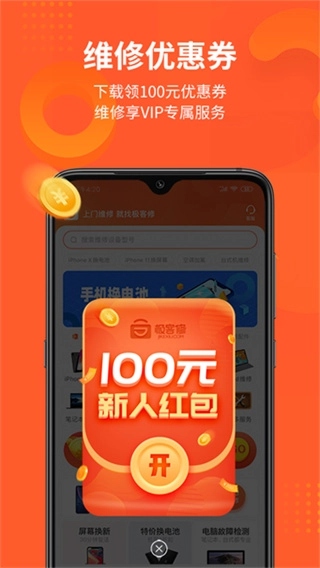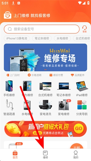 打开极客修App,进入应用后点击底部导航栏中的“维修”选项,即可进入维修服务选择页面。
