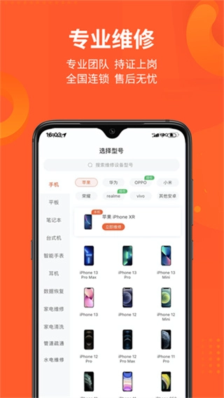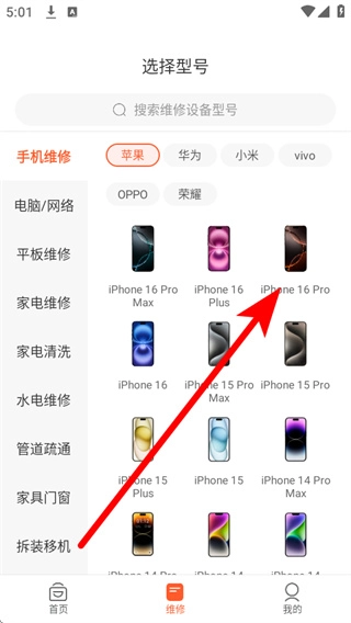 在维修页面里,需先挑选设备分类,接着确定具体的设备型号。