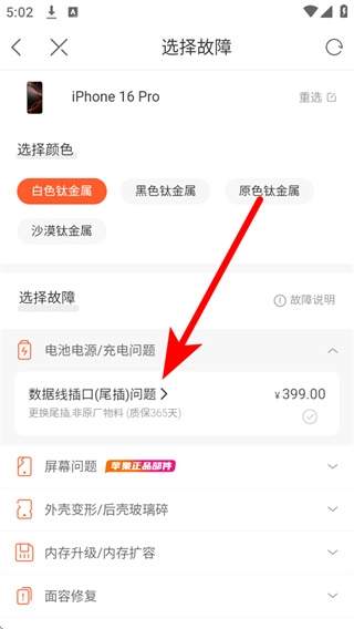 进入故障选择页面后,需先选定设备颜色,再从故障类型列表中选择对应的故障。