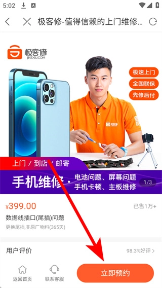 进入详情页后,点击页面底部的“立即预约”按钮,根据提示填写相关信息,就能完成维修服务的预约流程。