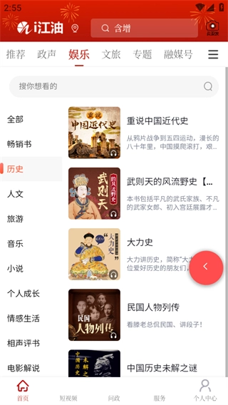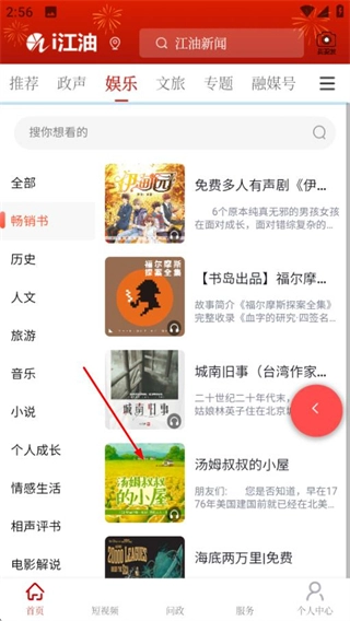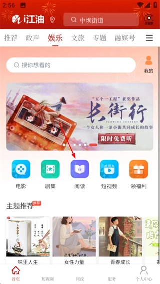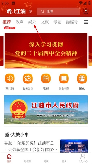 在i江油的首页,点击页面顶部的娱乐选项,就能进入娱乐频道页面。
