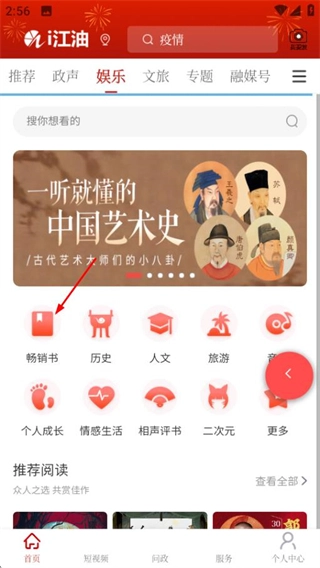 在娱乐频道页面,点击阅读选项进入阅读分类界面。