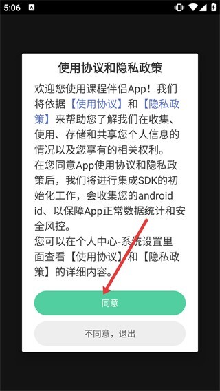 打开【课程伴侣App】后,要阅读【使用协议】与【隐私政策】,点击【同意】按钮来完成SDK初始化,进而使用App的各项功能。