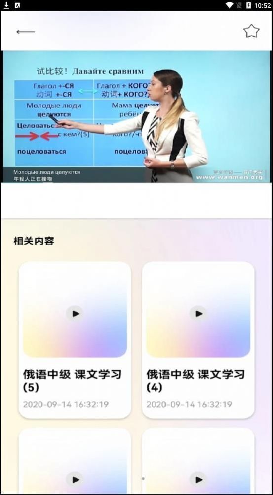 用户能够借助现场教学视频与俄语翻译的匹配,开启俄语字母的学习之旅。