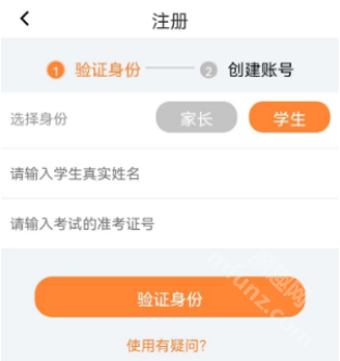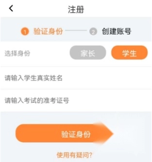 请依据您的身份选择“家长”或“学生”选项,然后输入考试时所用的姓名与准考证号(即学校考试中使用的考号),完成“身份验证”操作。