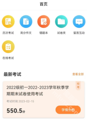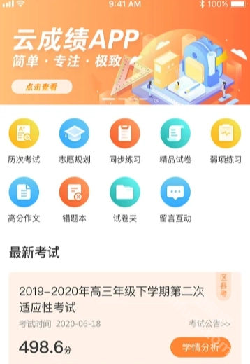 完成注册后,进入云成绩首页,查看最新考试及历次考试的相关信息,然后点击“学情分析”按钮。