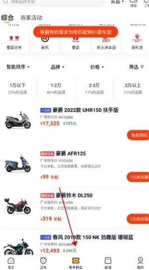 点击“新车特卖”板块,就能查看多款全新摩托的官方指导价、详细参数配置等信息;
