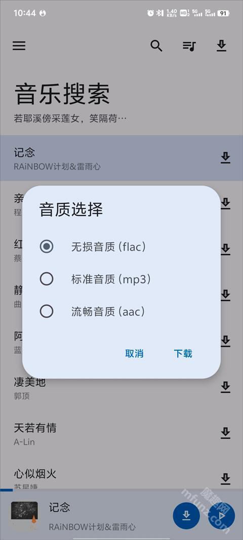 若您想在离线时收听音乐,只需点击对应按钮就行。该软件还支持选择不同音质,以此满足您对音质的多样化需求。
