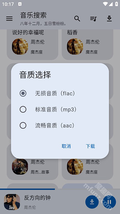 在搜索结果里找到您需要的音乐后,点击它右侧的按钮,然后选择您想要的音质就可以了。