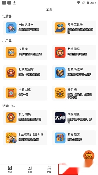 点击“工具”选项,这里为用户配备了mini记牌器、盒子工具版、卡牌库、竞技场选牌等实用功能;
