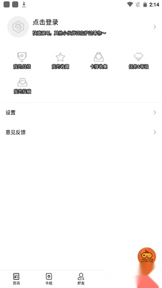 点击“我的”页面,用户登录后即可查看自己的战绩数据、收藏内容、卡牌收集进度以及任务等级等信息。