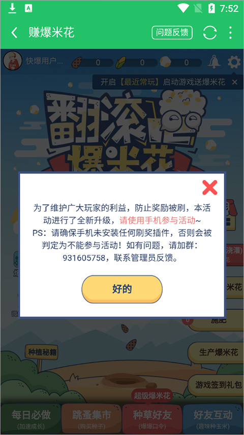 根据提示手机不能安装刷奖插件,否则不能参与活动