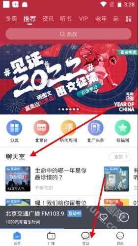 进入天天FM后,可先点击首页的聊天室,也能点击下方的“互动”按钮。