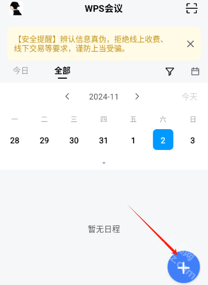 登录WPS会议后,选定会议时间,接着点击右下角的加号按钮。