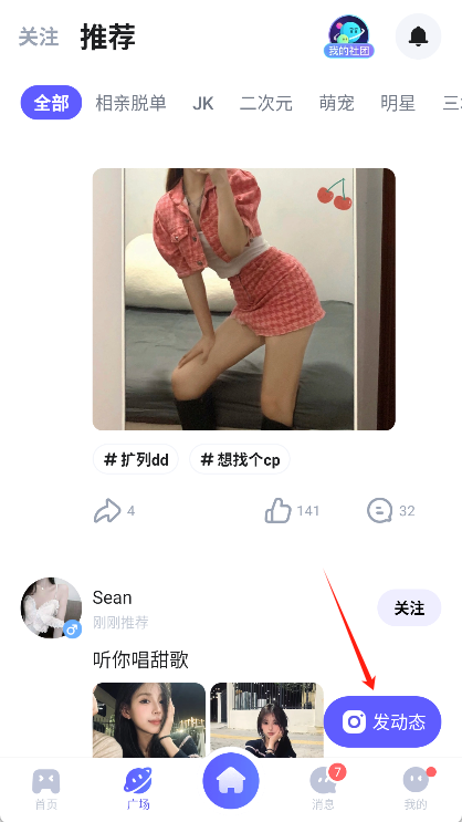 进入广场页面后,点击页面右下方的“发动态”按钮。