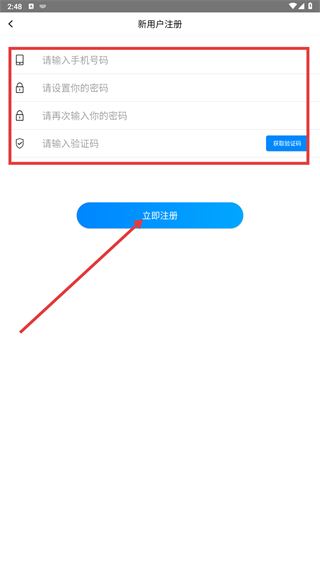 要是还没有账号,可点击【没有账号-立即注册】,进入新页面后填写【手机号-密码-验证码】,再点击【立即注册】按钮即可。