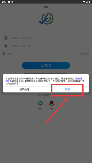 在登录界面弹出的提示框中,点击【同意】按钮,确认隐私政策后即可继续后续操作。