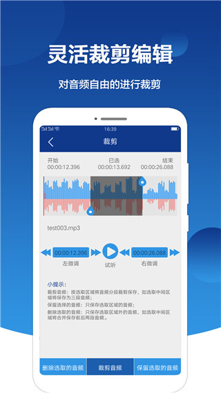 能够对音频内容进行自由的微调与裁剪,从而得到自己需要的音频片段。