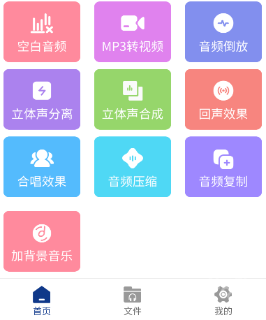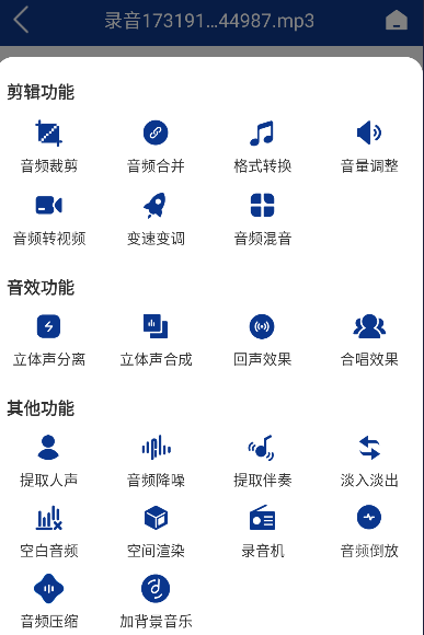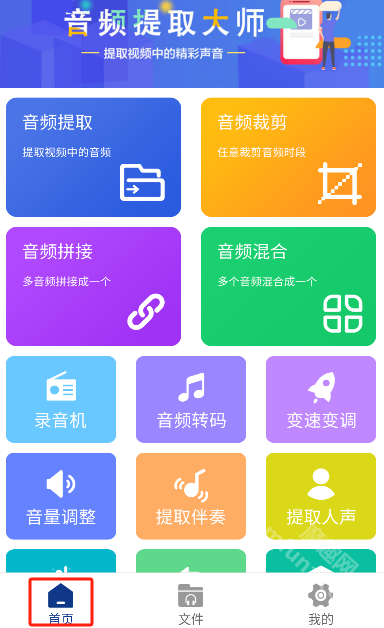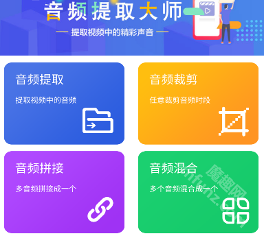 音频提取大师的首页集成了音频提取、音频裁剪、音频拼接、音频混合、录音机、音频转码等多项功能。