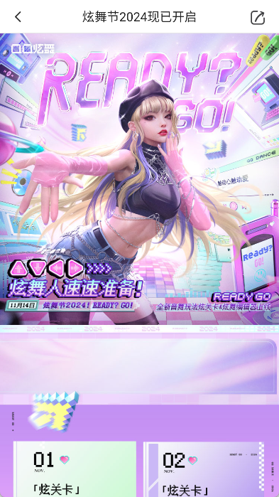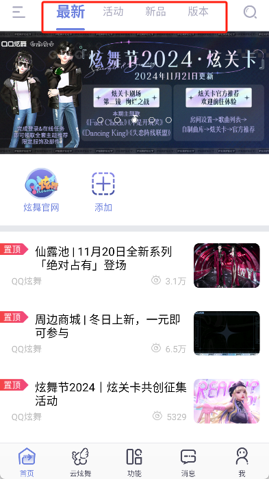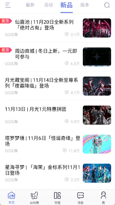 登录后进入首页,便能看到QQ炫舞的最新活动、新品发布以及版本更新信息。