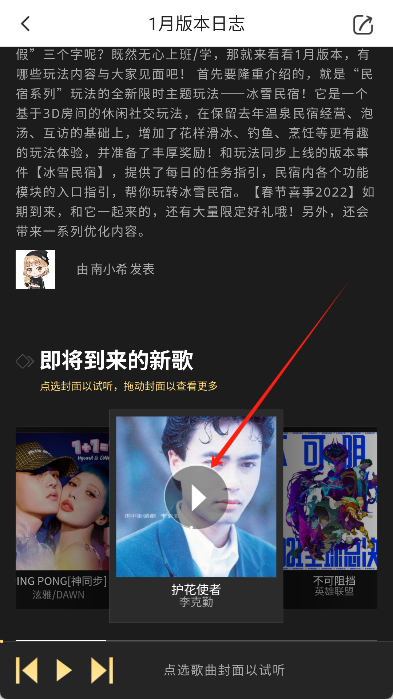 点击“版本”选项进入日志页面,即可查看即将上线的歌曲信息,同时还能进行试听。