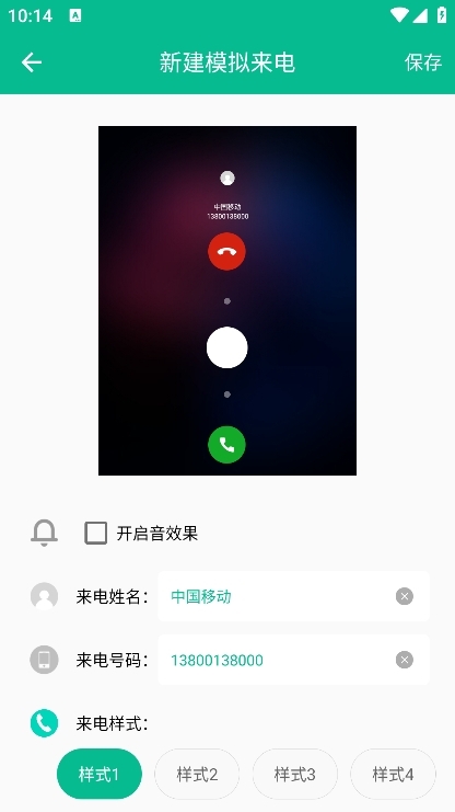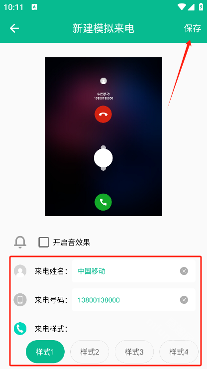 在设置界面完成来电号码、姓名和来电样式的设置后,点击右上角的“保存”按钮。