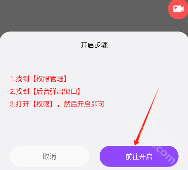 打开悬浮录屏助手后,点击【前往开启】按钮,然后找到【权限管理】选项。