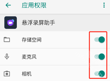 在应用权限设置窗口中,开启存储空间、麦克风和相机这三项功能的权限就可以了。