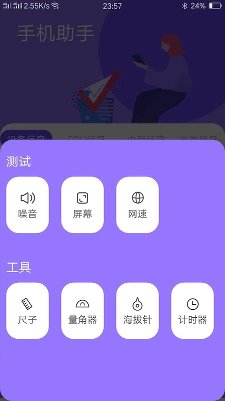 小磊手机助手app是一款优质的手机助手软件,线上可以为用户提供详细的手机参数等的信息,用户能够轻松知晓,同时还有网速燥音等等的测试,帮助用户可以更好的使用手机,轻松进行相关的管理,线上还提供有多种实用的手机小工具,尺寸、量角器、计时器等等都可以使用到!