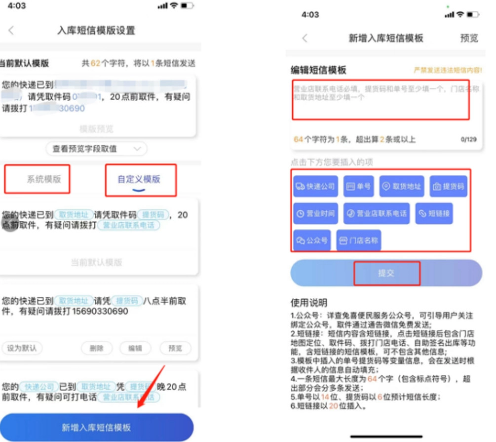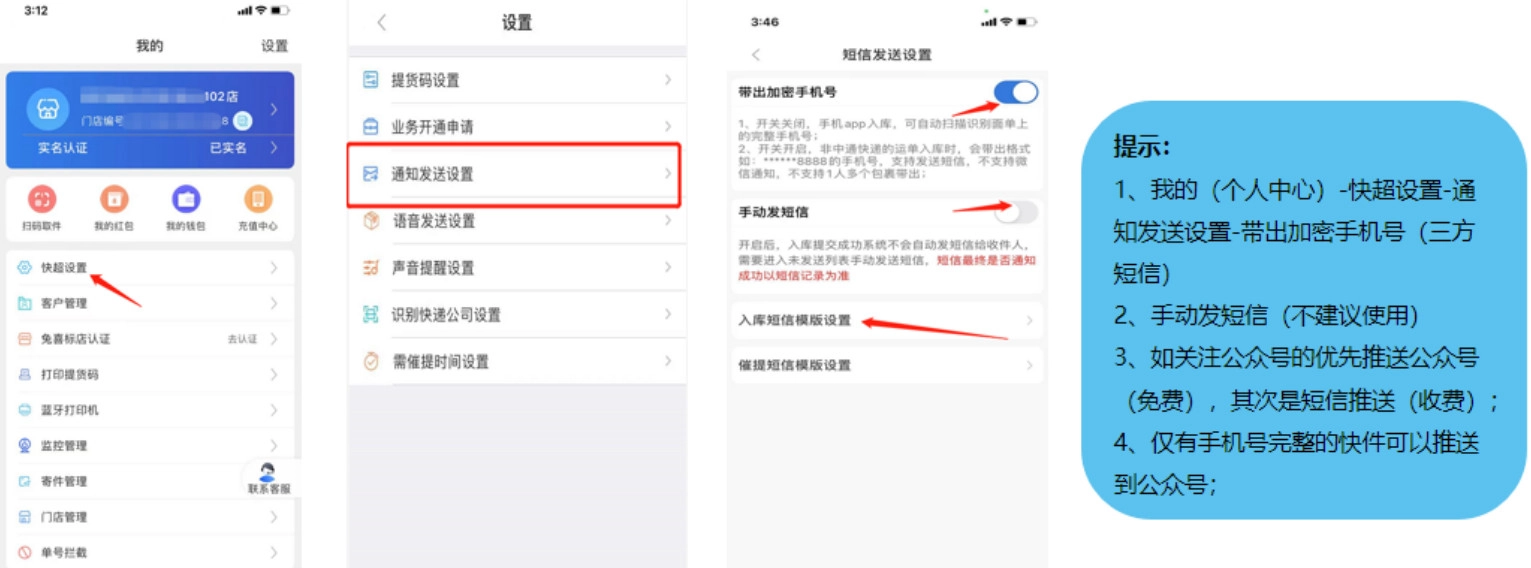 短信异常分析导致短信异常的情况有以下三种:1、门店操作不当a、"手动发送通知”功能被打开,入库后进入“未通知”实际未发送短信,需要将此功能关闭。b、“通知异常”显示发送失败,门店并未操作重推。(短信模板里面有短链接的,有些快递公司会拦截此类短信,建议更改短信模板)c、CR识别错误(我的-客户管理-普通客户-查找该客户将手机号修改-保存)。2、收件人实际并未查看通知a、关注公众号注册手机号后,完整手机号订单会优先推送至公众号,请及时查看。b、收件人或卖家更改订单的手机号信息,面单未同步,OCR无法识别更改后的电话。3、系统问题不同快递公司对应的短信供应商较多,通道出现不稳定的情况。门店认证账号申请一、门店认证入口二、上传认证信息三、提交认证信息四、门店审核状态