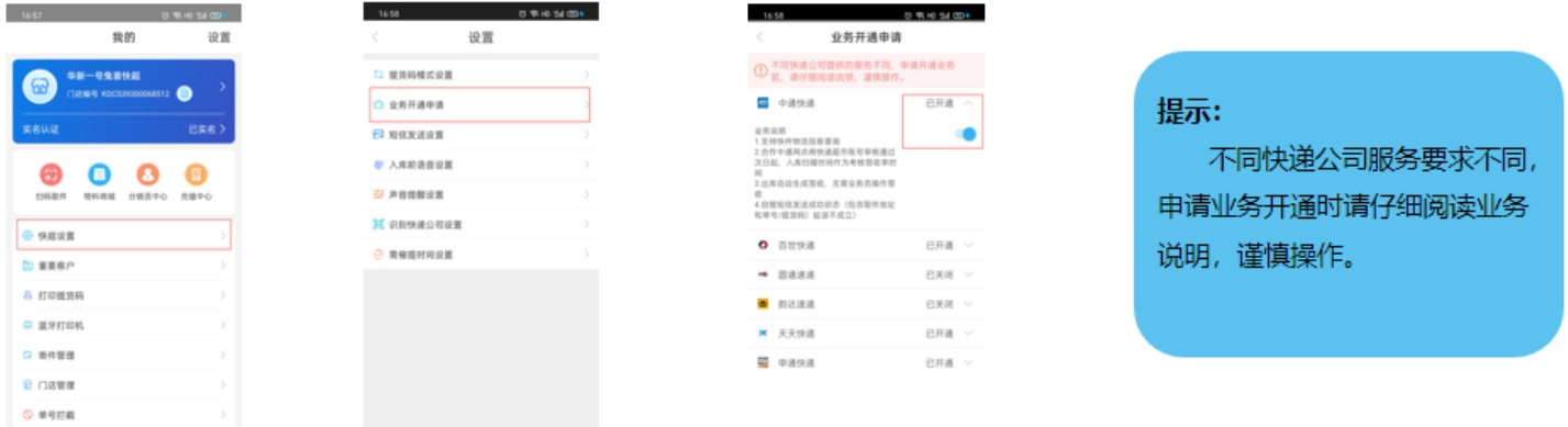 入库前,门店需开通对应快递公司的业务,这样入库才能符合该快递公司时效签收率的考核要求;若业务开通申请中未包含某快递公司,则仍可正常入库并向客户发送自提短信。