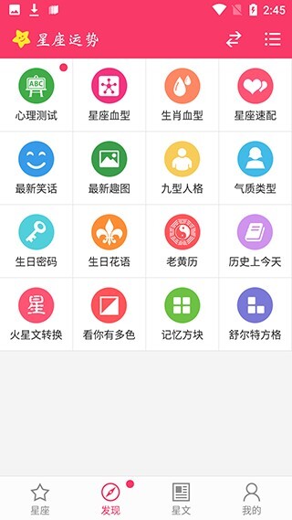 点击底部的发现栏,就能查询生肖血型、黄历、花语等其他相关信息。