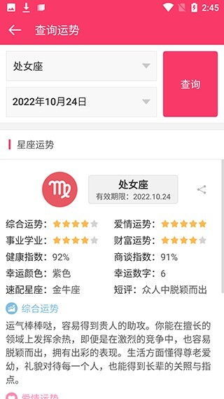 比如点击查询运势,选择自己的星座以及想要查询的日期,就能查看当天的运势情况。