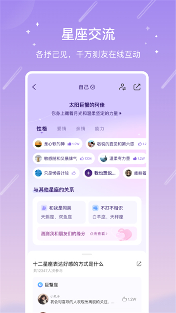 测测星座是一款专注于星座分析的软件,专业的评估体系、趣味心理测试以及深度星座解读功能。用户可与专属AI智能体实时互动,快速获取各类星座知识解答;平台还设有完善的社区板块,方便大家分享心情,在线心理达人会及时提供专业支持。此外,丰富的特色功能助力用户更深入地探索内心世界,以更积极的心态应对不同挑战。社区内话题覆盖多个领域,用户可自由参与交流,获取多元知识。