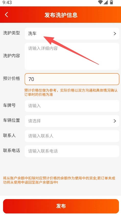 在页面上选择发布洗护类信息,将洗护类型设置为洗车,并填写好对应的相关内容。