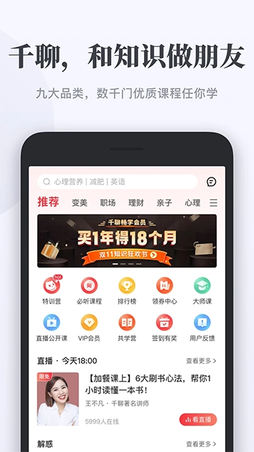 千聊整合了海量优质课程、热门经典解读与共读活动、笔记学习社区等多元服务,助力用户轻松获取新知识。我们的目标是打造国内领先的家庭及个人成长知识服务平台与学习品牌,推动用户实现自我提升。平台课程内容丰富多元,涵盖生活、职场、文化、艺术等多个领域,各学科均由行业专家提供优质资源支持。此外,用户还能参与或收听热门经典解读与共读,和其他学习者交流探讨、分享经验感悟;在千聊的笔记学习社区里分享笔记、共同进步,更是学习过程中别具乐趣的体验。