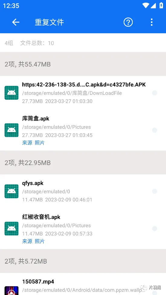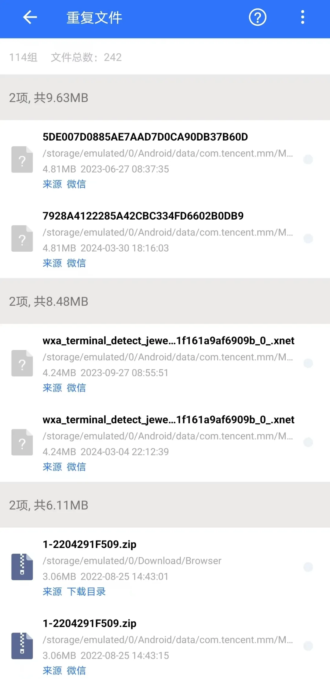 4. 重复文件:可快速检测并定位手机里内容完全相同的重复文件,配备一键选中功能,助力用户轻松完成清理操作。