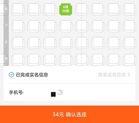 4、进入选座界面,挑选合适座位后,确认所选座位并提交订单完成支付。