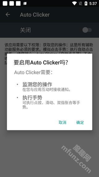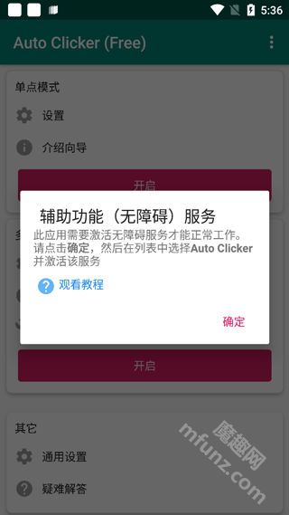 1、启动Auto Clicker连点器应用,第一次进入时,系统会自动弹出是否开启无障碍服务的提示,此时选择【确定】按钮即可。
