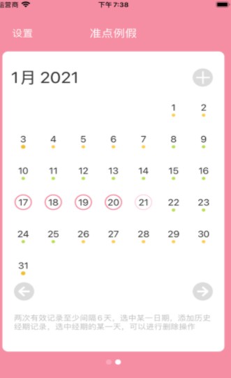 1.快速记录您的月经周期,并用不同颜色的小点告诉您您正处于月经周期的哪个阶段。