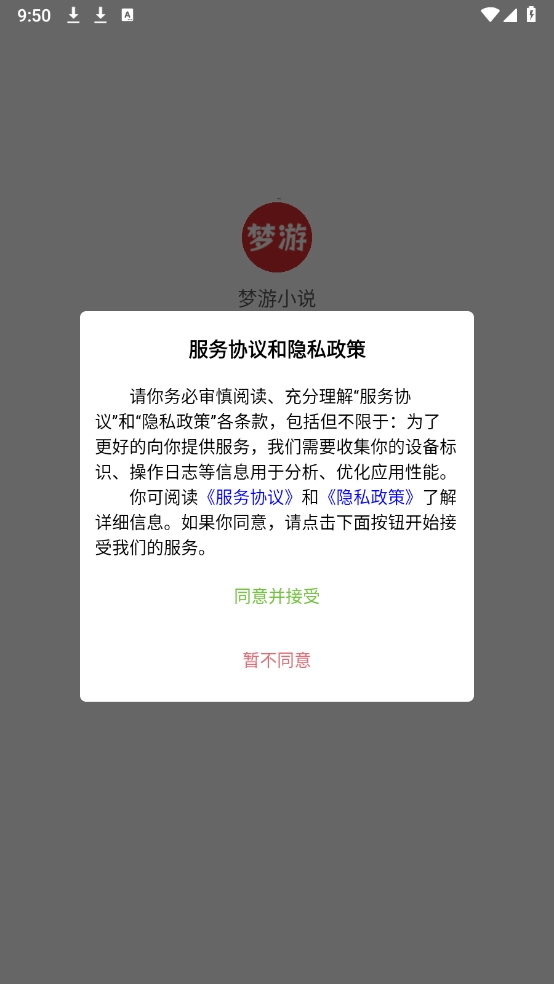 1、安装梦游小说,同意相关的政策与协议之后打开。