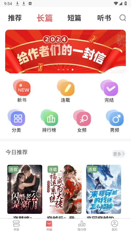 进入首页后,在“书城”板块可以看到丰富多样的小说类型,涵盖言情、科幻、武侠等多个类别。