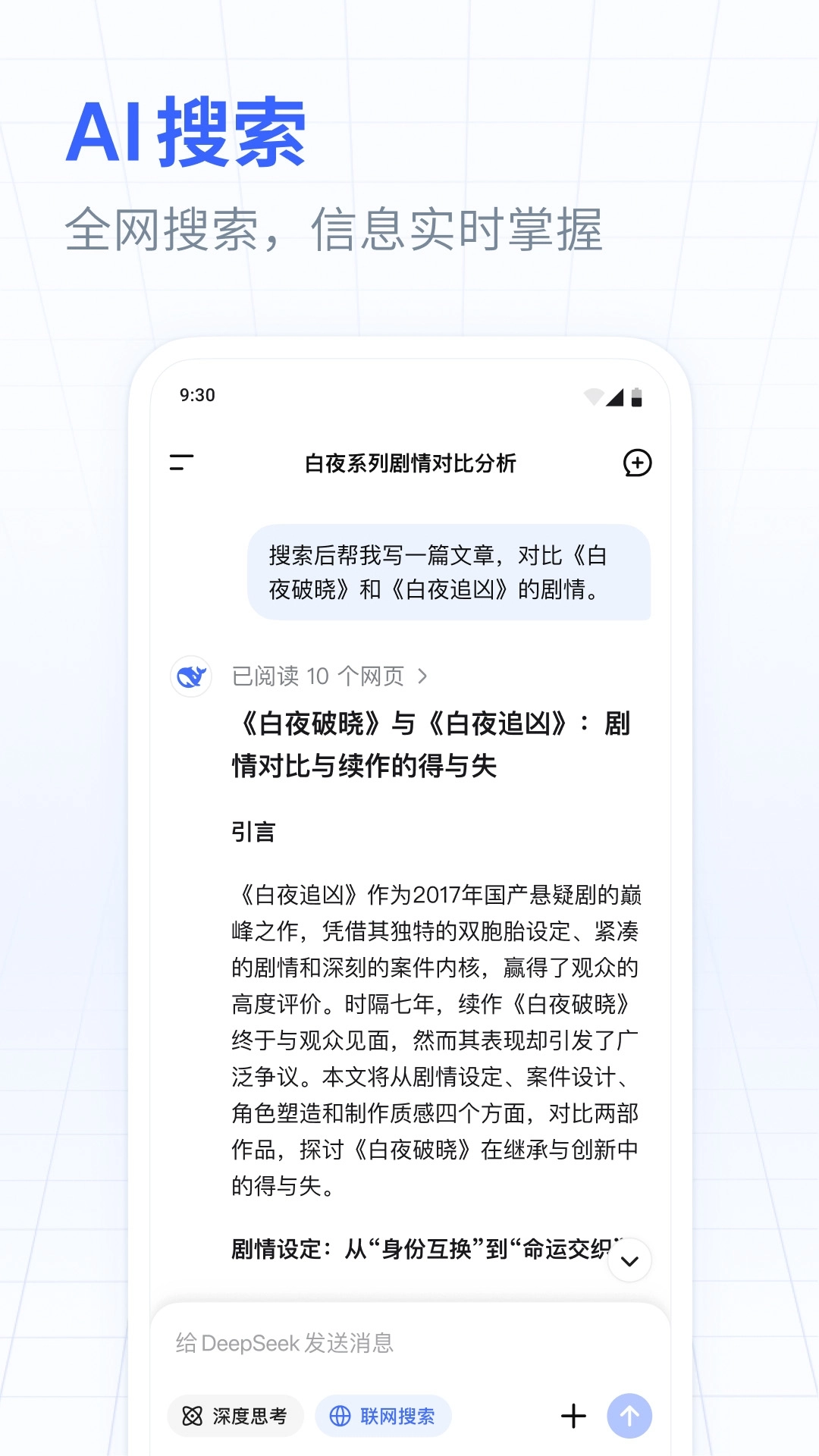 DeepSeek免费版作为一款备受好评的智能AI工具,集对话互动、内容创作等功能于一体,能够为用户答疑解惑、赋能生产场景;它具备智能问答、全网资源检索、高效文档解读的能力,同时支持深度思考与联网搜索,致力于打造流畅自然的智能对话体验,不仅响应即时、交流顺畅,还能让用户随时获取最新资讯,并且支持通过文件上传来提取所需信息。