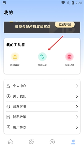 进入“我的”页面后,找到“我的工具箱”,点击其中的“浏览记录”选项。