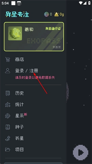 1、在异星专注的主界面,点击左上角的菜单按钮,展开功能列表。